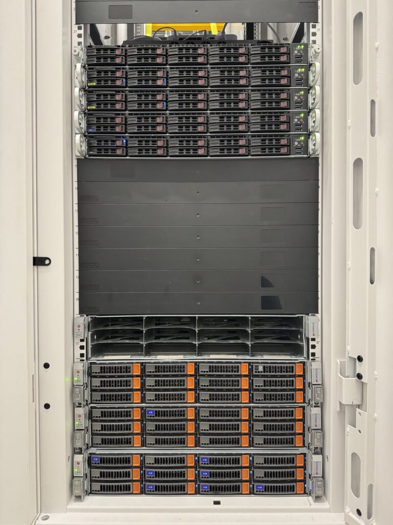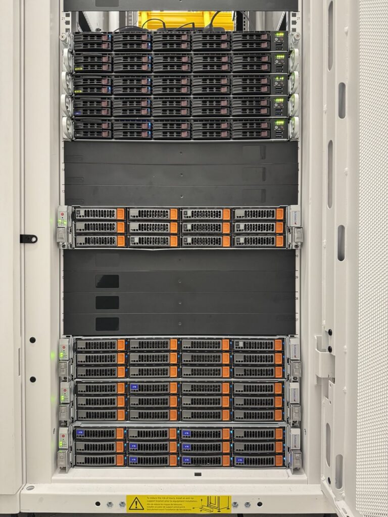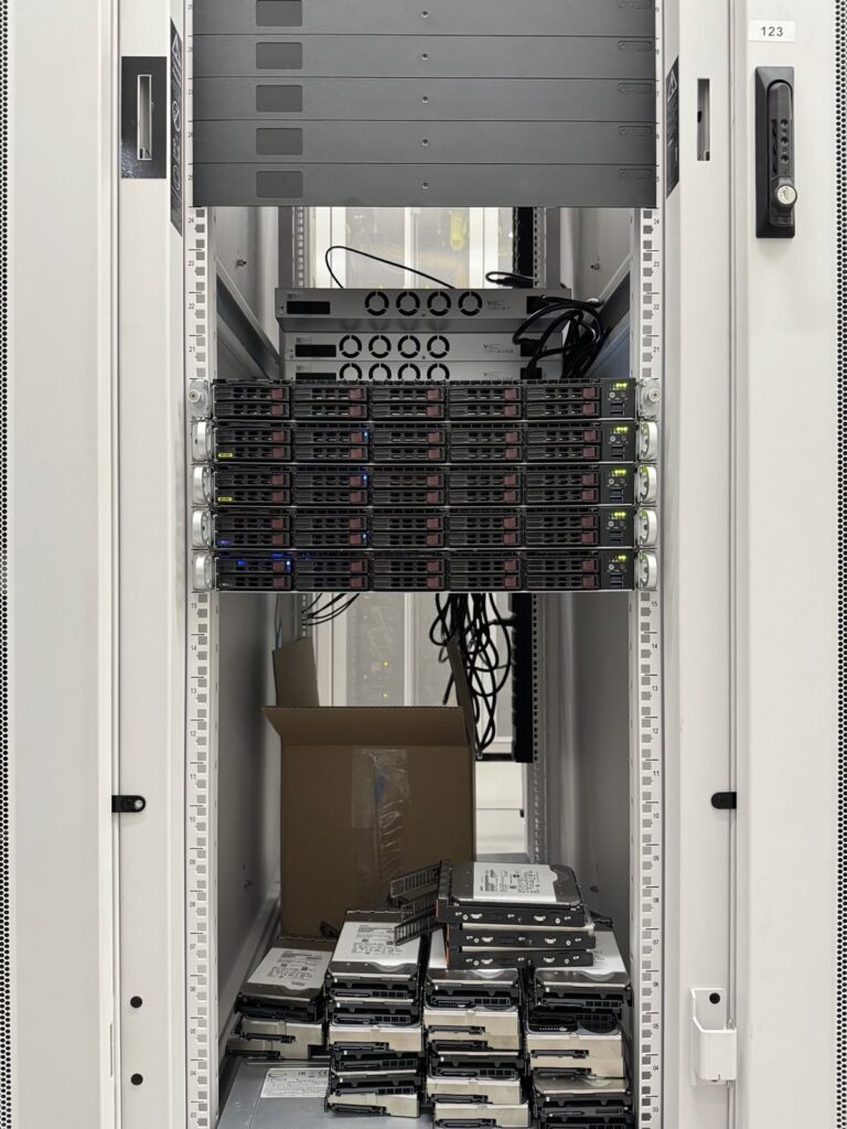 - Storage: 3x dual CPU servers, each with 192GB of RAM and 36x HDDs with 360TB of raw storage (fully expandable)