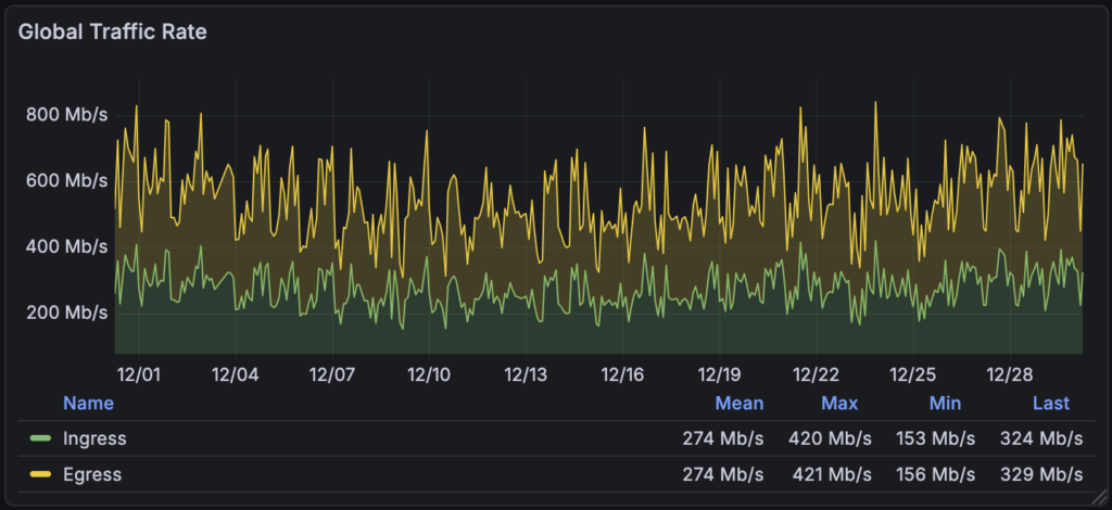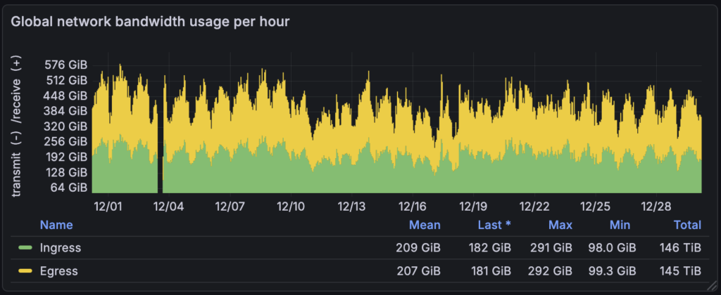 Over the past 30 days we have received and transmitted over 162TiB of Tor traffic. If this rate continued for a year, that would still be nearly 2PiB of bandwidth usage for a whole year. Combined with our Unredacted Door services, that would be nearly 5.5PiB in total. That’s still excluding all of our other services. For comparison, Signal pushes around 20PB a year on their call relays, despite being much larger than us.