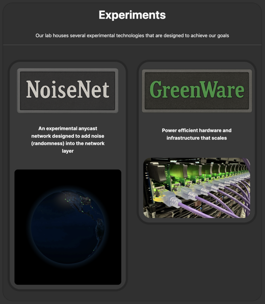 One of our most ambitious projects of 2025 was NoiseNet (AS401401). Launched under Unredacted Labs, NoiseNet is an experimental anycast network spanning the globe. It is designed to make it more difficult for censors to perform traffic correlation attacks against parts of our network. If a threat actor were to breach our network, or our upstreams, our goal is to make their their task much more difficult. NoiseNet adds a layer of ‘noise’ via asymmetrical traffic flows, encrypted tunnels, and the sometimes unpredictable nature of anycast. In 2026, we will further develop software that will run on our machines to delay packets and transmit cover traffic, adding even more noise.