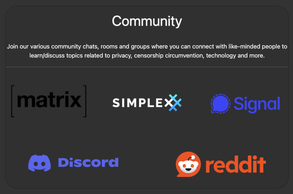 - Unredacted Proxies (uses Signal’s TLS proxy & Telegram’s MTProto proxy)